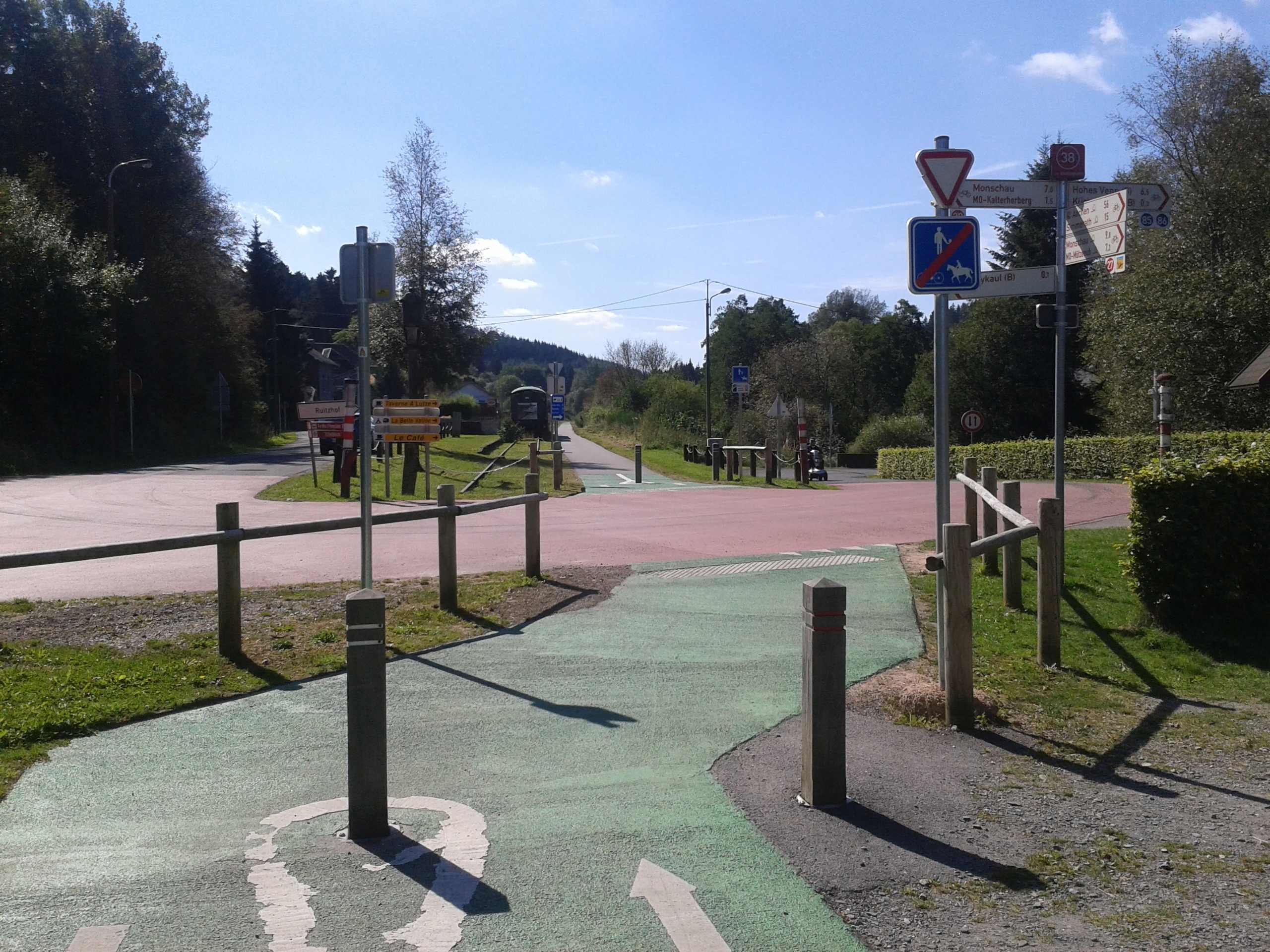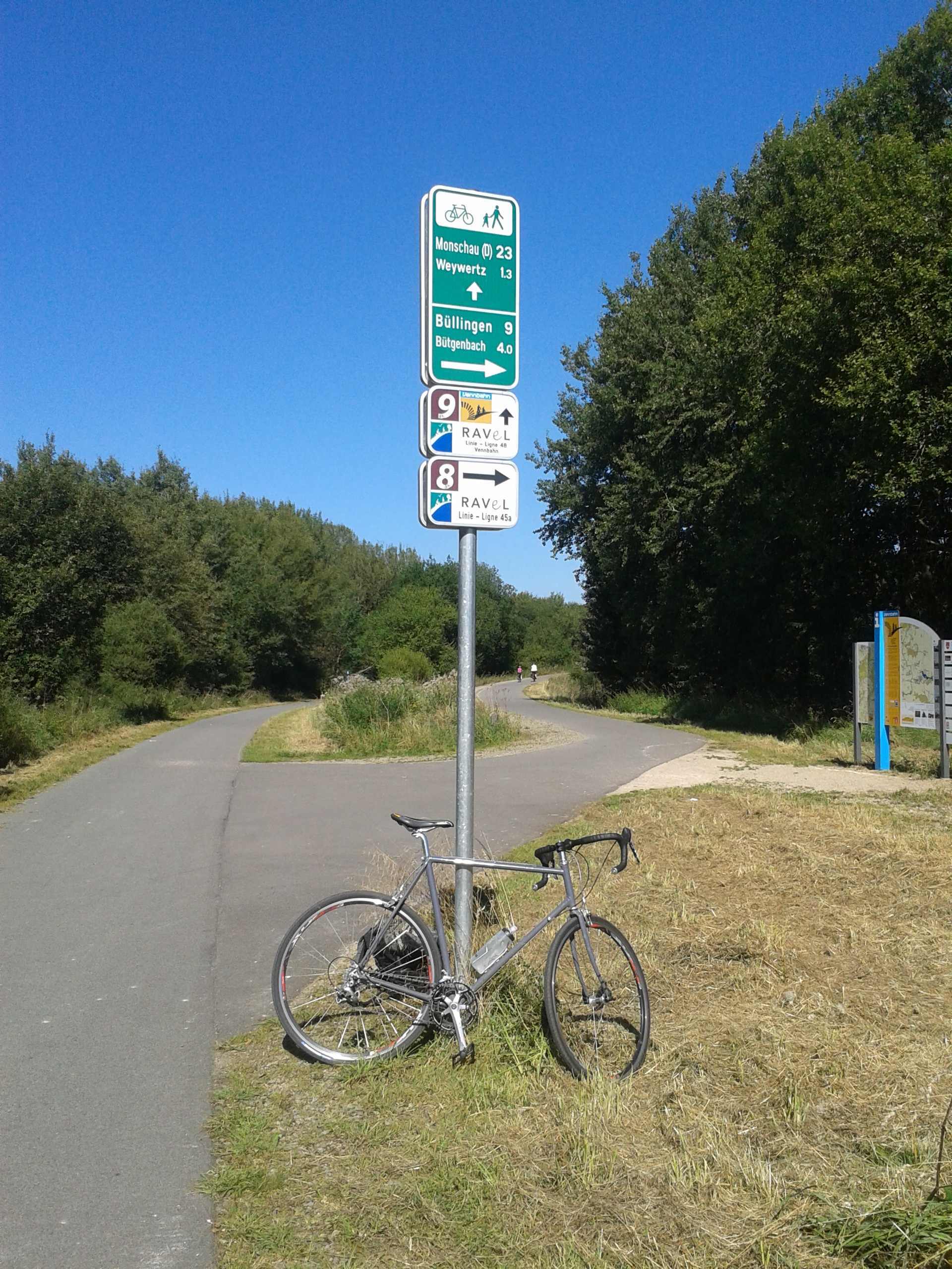 Am Ende der Strapaze winkt ein Schild in der Gegenrichtung, Ende der Ausbaustrecke, bis Büllingen 5 km. Es sollte besser heißen: nach Büllingen noch weitere 5 km bis zum Beginn der Ausbaustrecke! Es soll wohl so sein, dass der letzte Abschnitt 2017 wohl auch asphaltiert wird. Ravel nennt sich das belgische Wegeprogramm für den langsamen Verkehr, heißt Fußgänger, Radfahrer und Reiter, welche auf ehem. Bahntrassen oder entlang von Kanälen und Flüssen auf ehem. Treidelwegen geführt werden. Ravel No 45 und 45a stehen analog er alten Bahn-Kursbuchstrecken für meine beiden Bahntrassen heute.