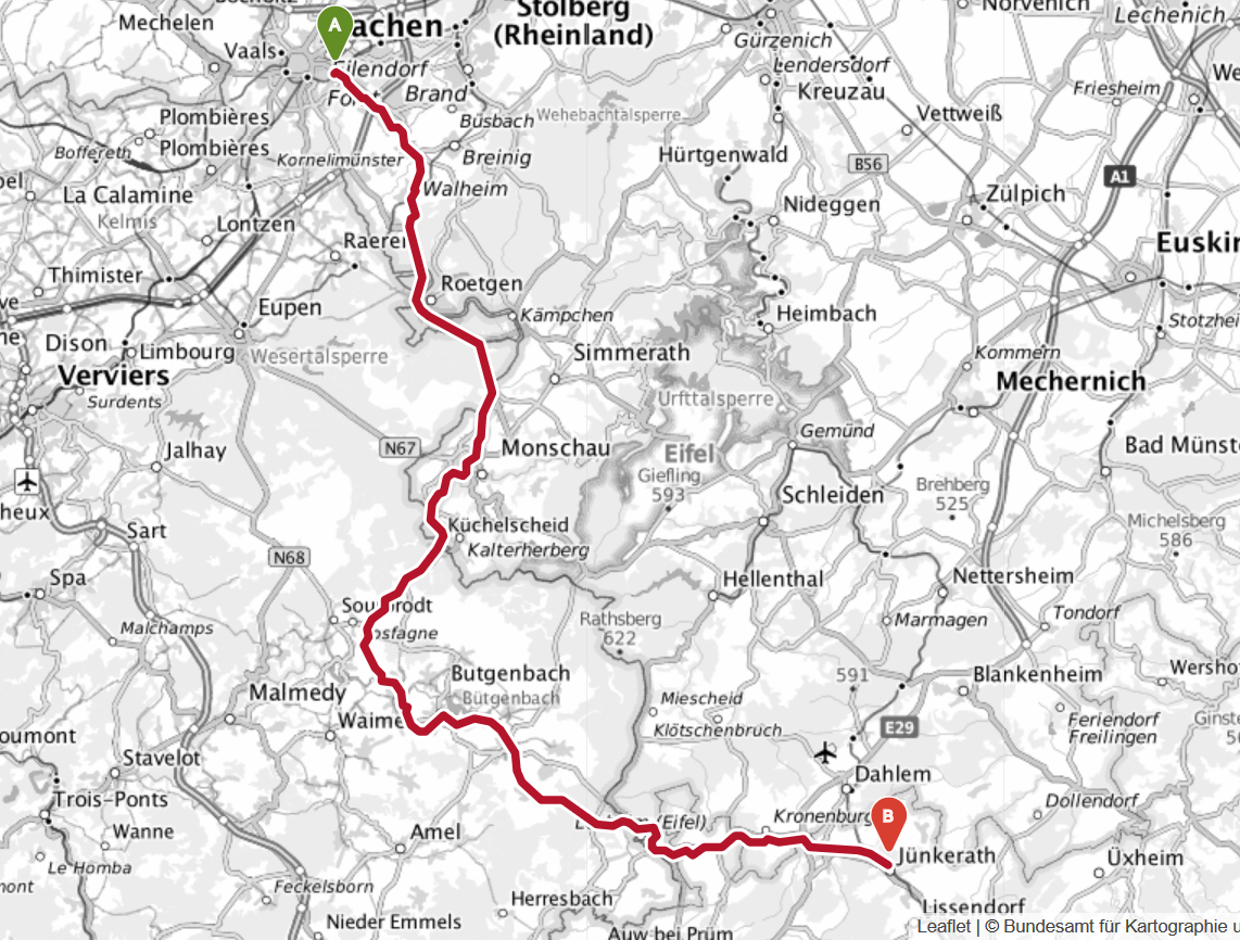 Aachen – Jünkerath, eine tolle Rennradstrecke. Und wenn die entsetzliche schikanöse Schotterpassage sich in eine Asphaltroute verwandelt, dann ist die 105 km lange Route einfach Klasse.