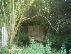 Weitere menschliche Zeugnisse befanden sich plötzlich vorraus, ich traf auf die B50, doch mein Interesse galt einer kleiner Brücke über den nahen Bach, beim näheren Hinsehen stellte sie sich als eine Bahnbrücke unserer Kleinbahn und als eines der wenigen Überbleibsel der Strecke hinaus. Am Wiesenrand entlang konnte man die Brücke zu Fuss erreichen und "besichtigen". Hier lag wohl auch irgednwo der Bahnhof Dudeldorf. Von hier aus Richtung Phillipsheim ging es durch die Hölle, wie die Lokführer damals wohl sagten.