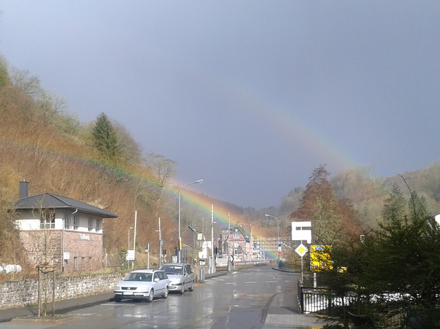 Ostersonntag in Kyllburg. Zwischen den nachmittäglichen Sonnenstunden sorgte ein kräftiger Regenschauer für diesen ebenso kräftigen Regenbogen über den Kyllburger Bahnhof.